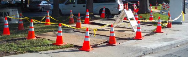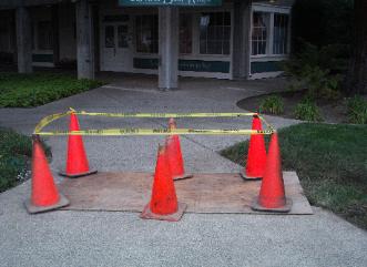 | Duct Tape after One Day in the Sun. Not protecting anything, and causing a pedestrian hazard of their own. |